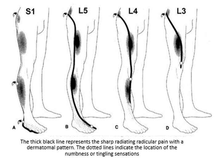 Typical patterns of pain in ‘Sciatica’ that affects different levels. *Important* - not everyone will follow this textbook presentation!