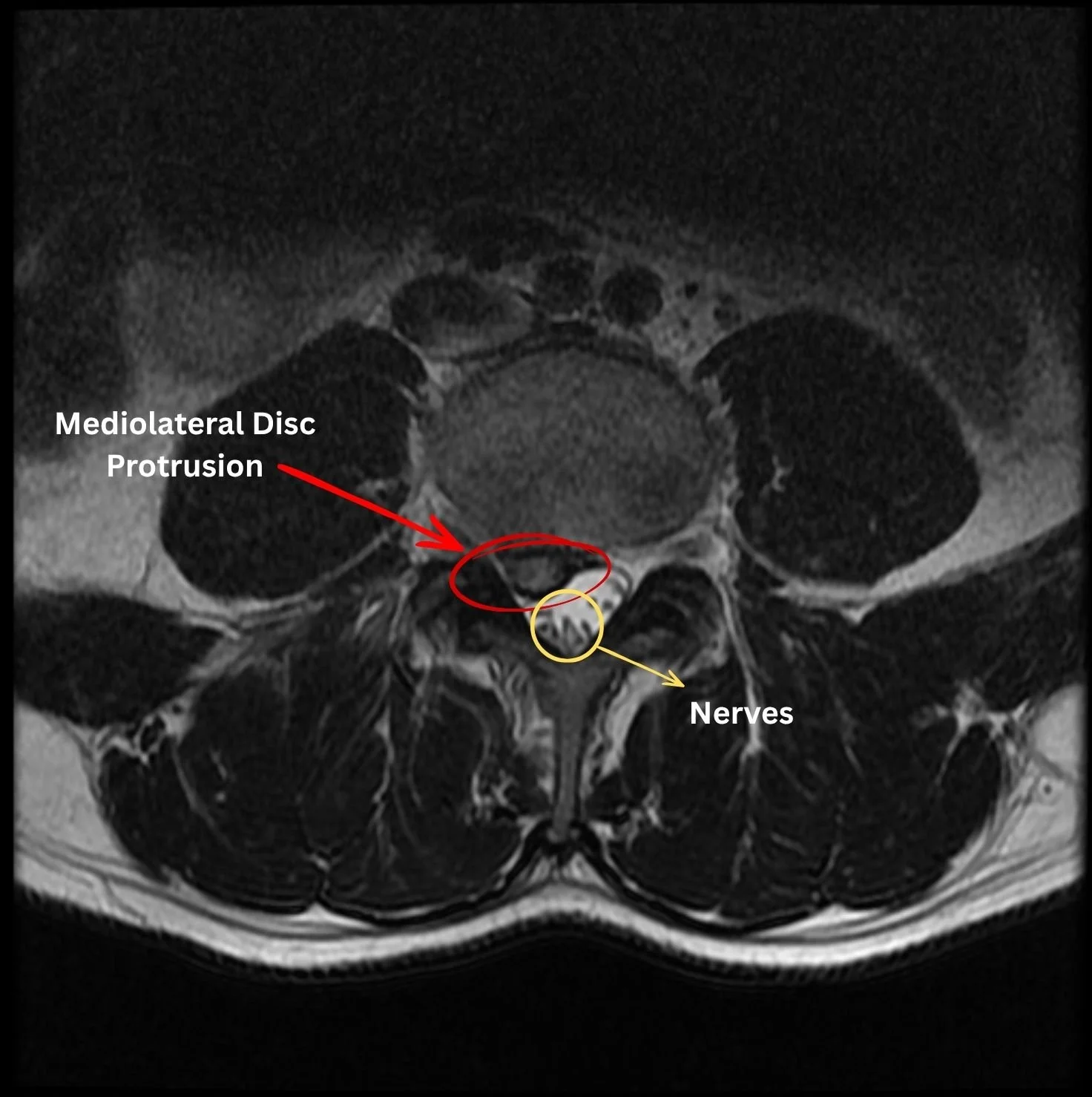 MRI of a mediolateral lumbar disc protrusion showing compression of the spinal nerves in the spinal canal.